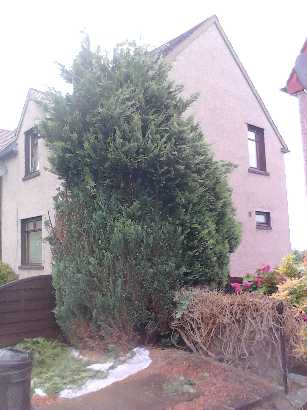 The example below shows an overgrown leyland cypress being cut down to a manageable height.